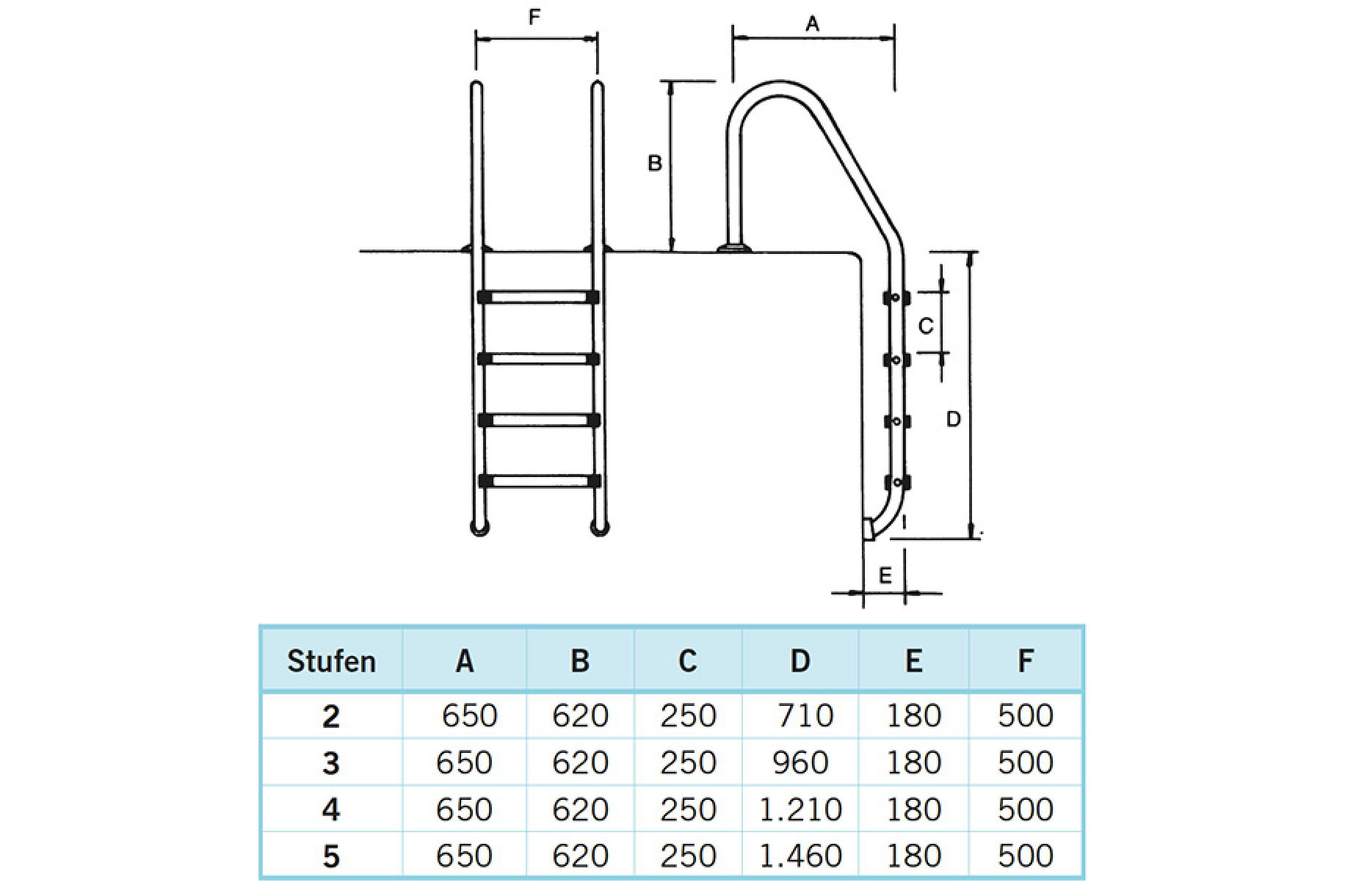 Einbauleiter Classic Edelstahl V2A weite Holmausladung 3 Stufen, bis 1,20 m