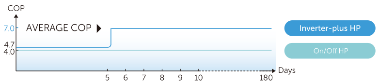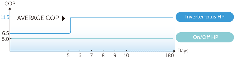 In den ersten 5 Tagen läuft eine Inverter-plus-Poolwärmepumpe mit 100% Leistung und erwärmt den Pool auf die eingestellte Temperatur. In den nächsten 175 Tagen wird mit einer durchschnittlichen Leistung von 50% von AVERAGE COP 11.5 ausgeführt, um die gewünschte Pooltemperatur aufrechtzuerhalten. Der DURCHSCHNITTLICHE COP ist also doppelt so hoch wie der einer Ein/Aus-Wärmepumpe. Also ein perfekte Poolheizung für Ihren Pool!