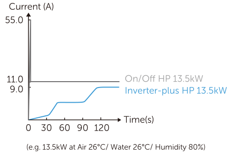 Wenn die Pool-Wärmepumpen Poolheizung Inverter-plus eingeschaltet wird, beginnt der Strom bei 0A und steigt in 2 Minuten langsam auf den Nennstrom an. Das Hausstromsystem wird nicht beeinträchtigt, während der häufige Anlaufstrom der Ein/Aus-Wärmepumpe das Fünffache des Nennstroms beträgt, ist dies eine Belastung für das Stromnetz.